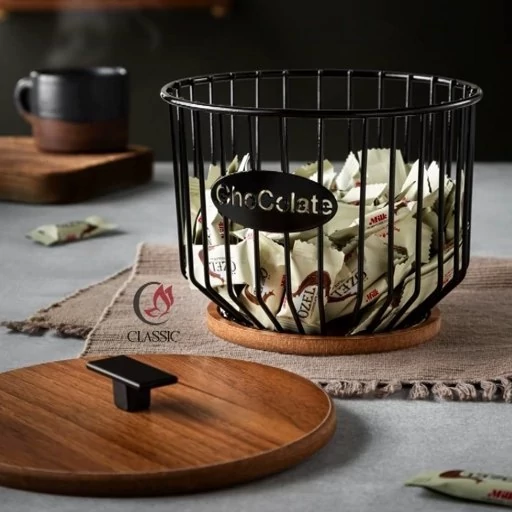 کندی و شکلات خوری یا جا گردو فلزی درب چوب طرح بلوط مناسب برای استفاده در آشپرخانه و حتی استفاده در پذیرایی، جنس درب و زیره چوبی از چوب ام دی اف هست